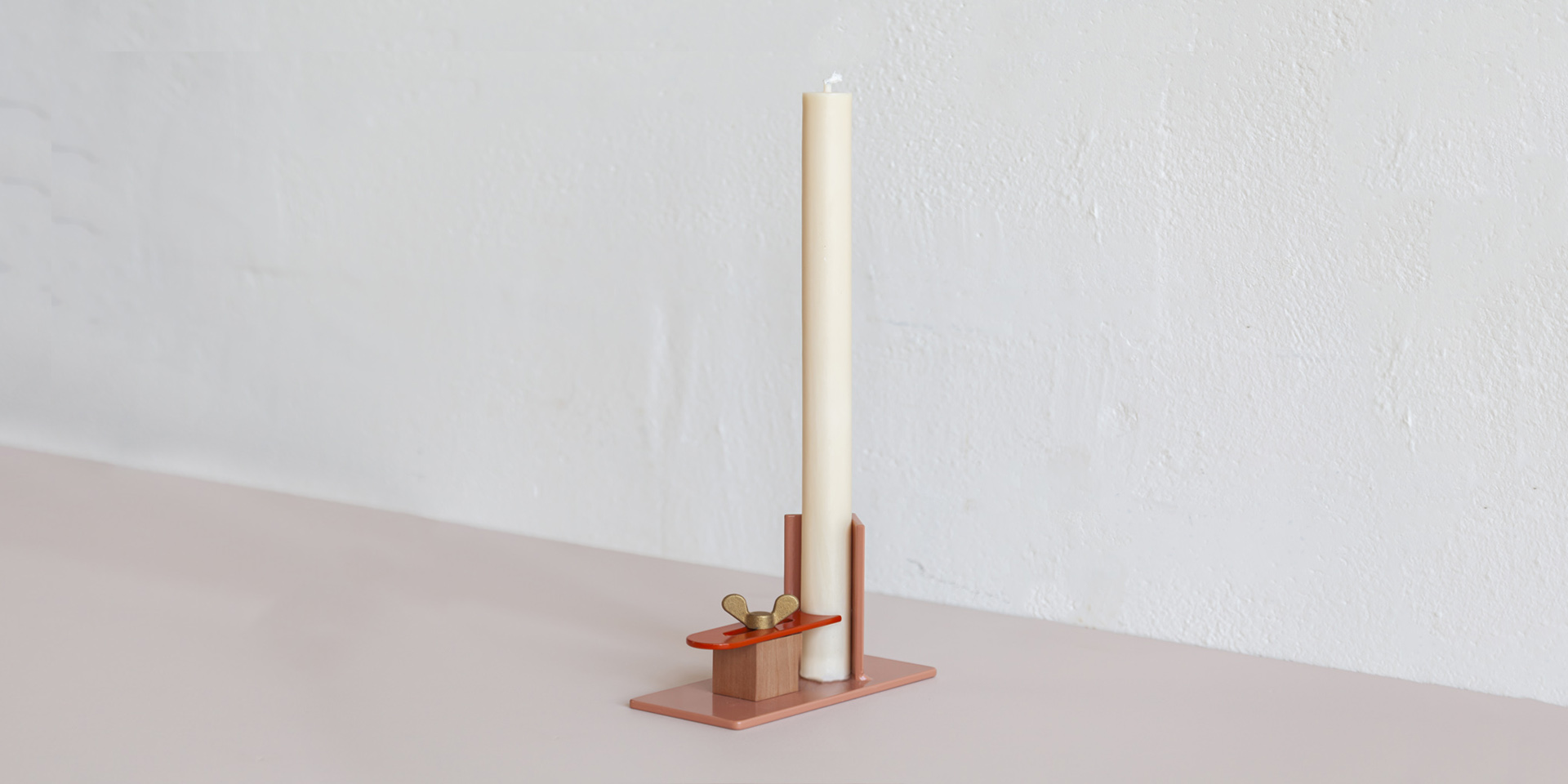 Wie het handschrift van Floris Hovers (her)kent zal zien dat het ontwerp van de kandelaar indirect voortkomt uit zijn vrije werk, waarbij hij zich richt op het maken van unieke assemblages en composities. Bij de kandelaar uit zich dit onder andere in het samenkomen van verschillende materialen: gekleurde stalen onderdelen worden gecombineerd met een perenhouten blokje en een messing vleugelschroef. Floris’ eigenheid in kleurgebruik is terug te zien in de verschillende kleuren waarin de Fixum te verkrijgen is.
