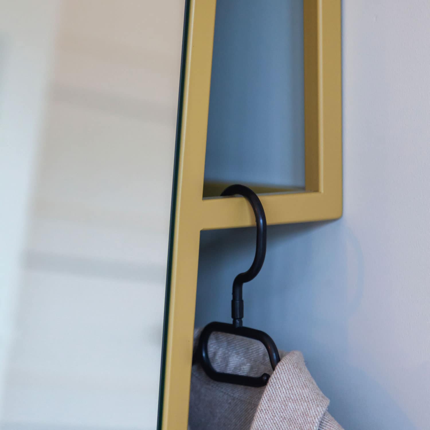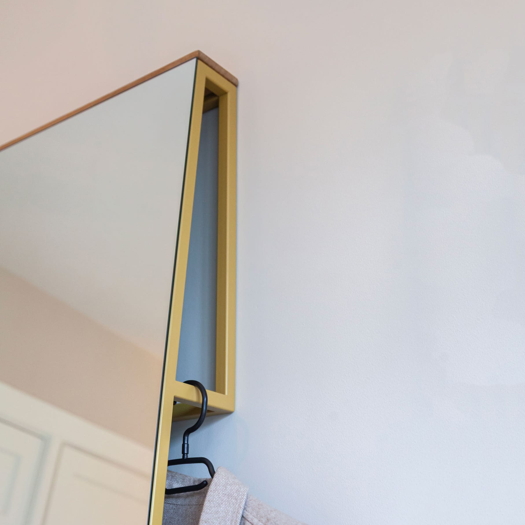 De Tangents Mirror is speels in zijn eenvoud. De schuine verbindingen in het metalen frame lijken speels, maar zijn tegelijkertijd functioneel. Doordat het frame aan de achterkant van de spiegel nonchalant tegen de muur leunt zorgt deze er namelijk voor dat de spiegel heel gemakkelijk blijft staan. Daarnaast geeft het frame ruimte aan een aantal kledinghangers. Een subtiel, grafisch en functioneel ontwerp, geschikt voor verschillende ruimtes.